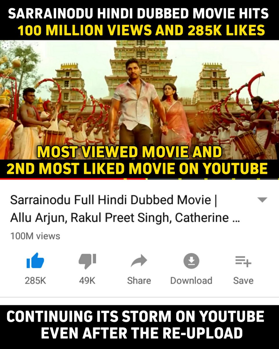 Alluarjunsuriyafc On Twitter Sarrainodu Storm On Youtube 100m Views Most Viewed Movie On Youtube 285k Likes 2nd Most Liked Movie On Youtube Sarrainoduhindihits100mviews Https T Co Anxvs24pmd - Most viewed youtube videos of all time 2021.